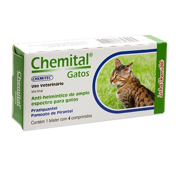 O vermífugo Chemital® Gatos é um anti-helmíntico de amplo espectro para gatos, que combate com eficácia formas adultas e larvárias de cestóides, ancilostomídeos e ascarídeos que infestam os gatos. Chemital® Gatos possui, além de excelente atuação, uma margem de segurança ampla que permite sua administração mesmo para fêmeas prenhes em qualquer época da gestação.
